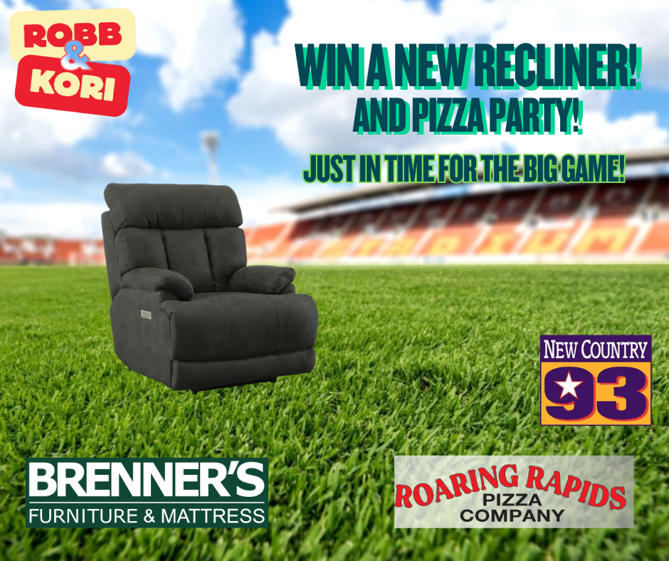 The “Big Game” 60 is coming February 8th and you could be watching it on a brand new sofa or recliner from Brenner’s Furniture, while enjoying Pizza from Roaring Rapids and New Country 93.3!